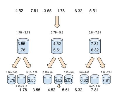 - Вычисление накопительных значений, чтобы получить позиции каждого элемента в отсортированном массиве․